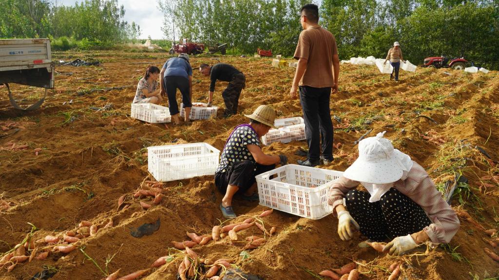 随着机械来回穿梭,一串串红彤彤的蜜薯破土而出,个个体态饱满、颜色鲜亮。薯农们忙着拾果、装筐,再将一筐筐蜜薯抬到地头,等待车辆运走。