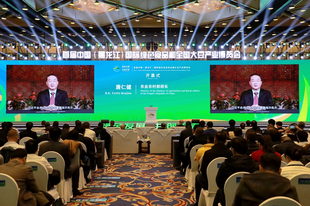 本网讯 11月15日,由农业农村部、中国国际贸易促进委员会、黑龙江省人民政府共同主办的首届中国(黑龙江)国际绿色食品和全国大豆产业博览会在哈尔滨开幕,农业农村部党组书记、部长唐仁健视频致辞,黑龙江省委书记许勤宣布博览会开幕,黑龙江省省长梁惠玲、新疆维吾尔自治区主席艾尔肯·吐尼亚孜致辞。唐仁健强调,要认真学习贯彻习近平总书记重要指示精神,落实党中央、国务院部署要求,政产学研各方面共同努力,产加储销各环节协同发力,持续提升大豆产能和自给率。