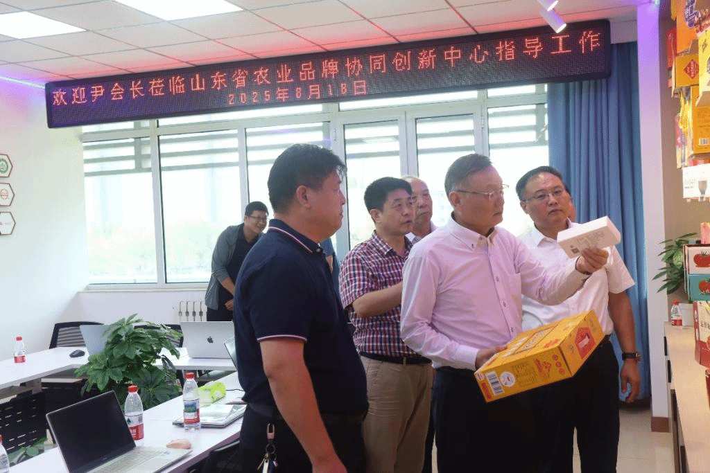 在实验室参观环节,尹国桥会长深入考察了中心展示的各类山东特色农产品,逐一了解企业产品的特色优势、生产工艺与保质期管理等细节,对实验室打造的沉浸式品牌体验模式给予高度评价。